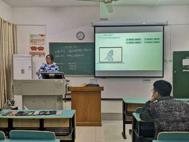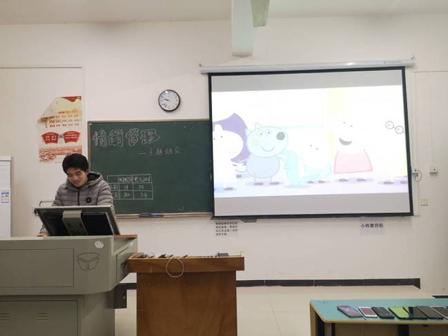 在班会过程中,各班心理委员针对各班存在的心理问题,通过讲解PPT提出解决办 法。在巡查过程中,我们发现大多数班级的班会主题都以“情绪管理”、“人际交往”为主,少数班级也选择了“珍爱生命”的主题。而对于大学生特别是大一新生而言,在对大学生活还不是很熟悉的情况下,这些问题也是困扰我们最多的。